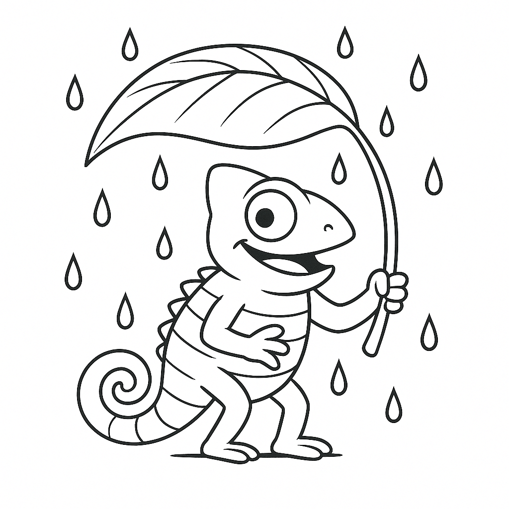 Ein niedliches Chamäleon, das sich vor dem Regen schützt – male Tropfen und Blätter in frischem Blau und Grün.