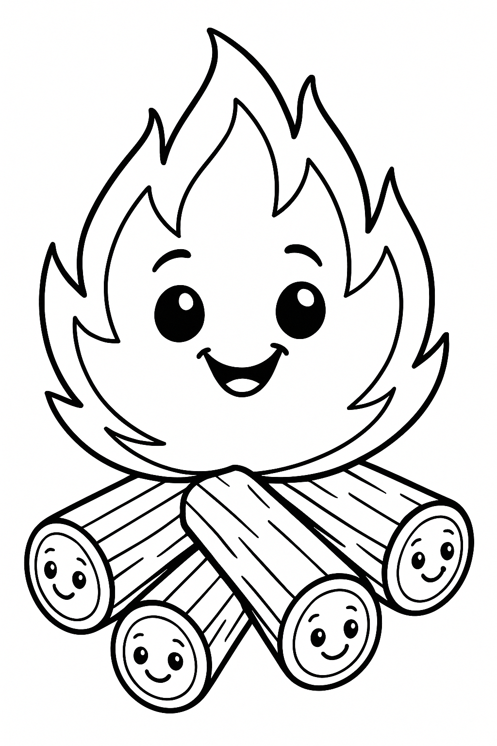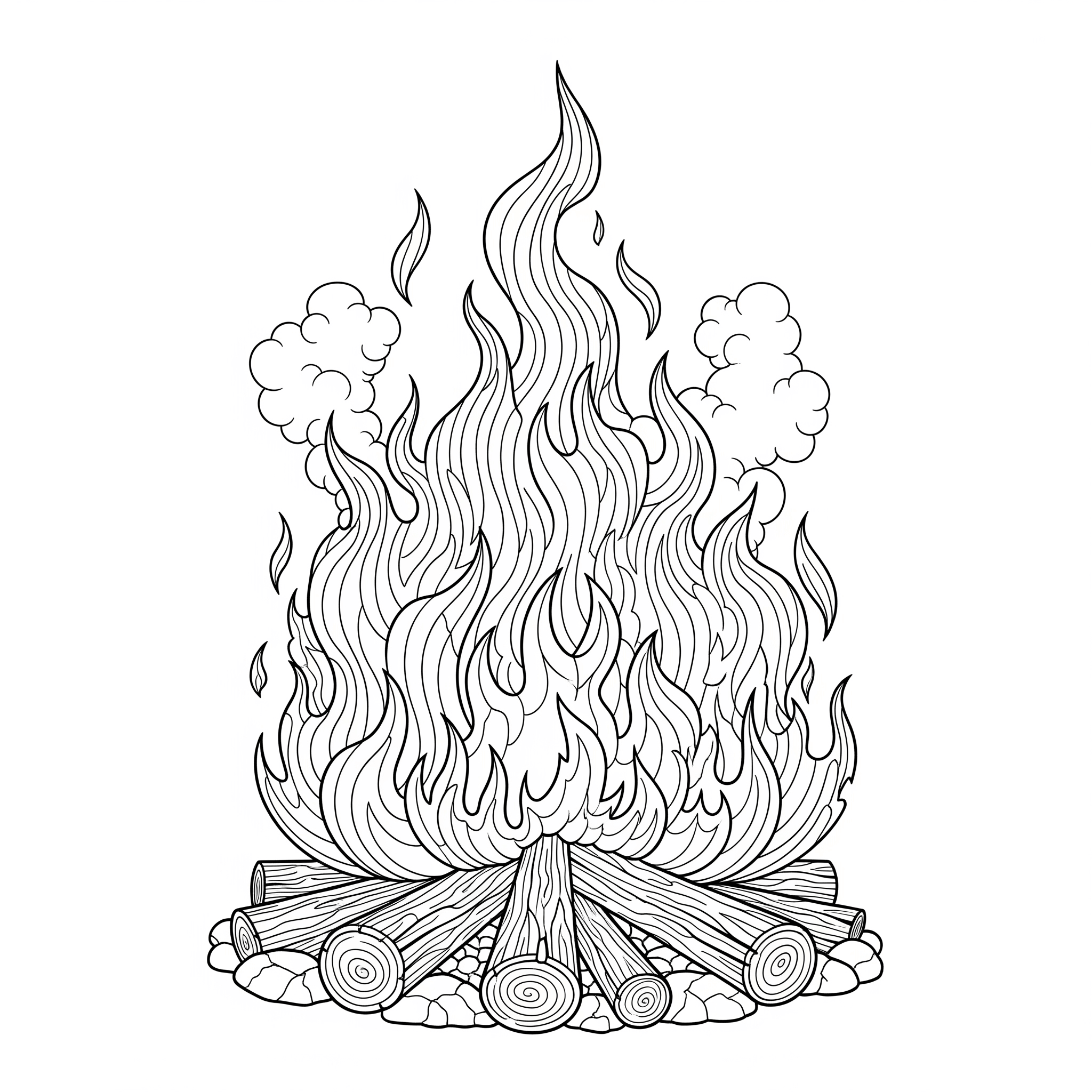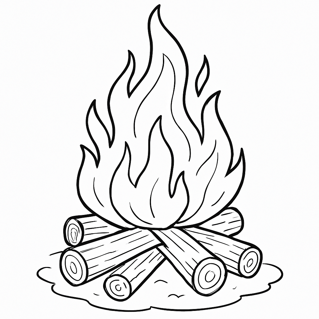 Ein klassisches Lagerfeuer mit Holzscheiten und Flammen – ideal für Sommerabende, Feste oder einfach zum Entspannen beim Ausmalen.