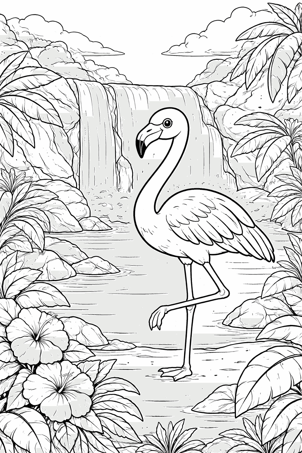 Flamingo am Wasserfall Ausmalbild
