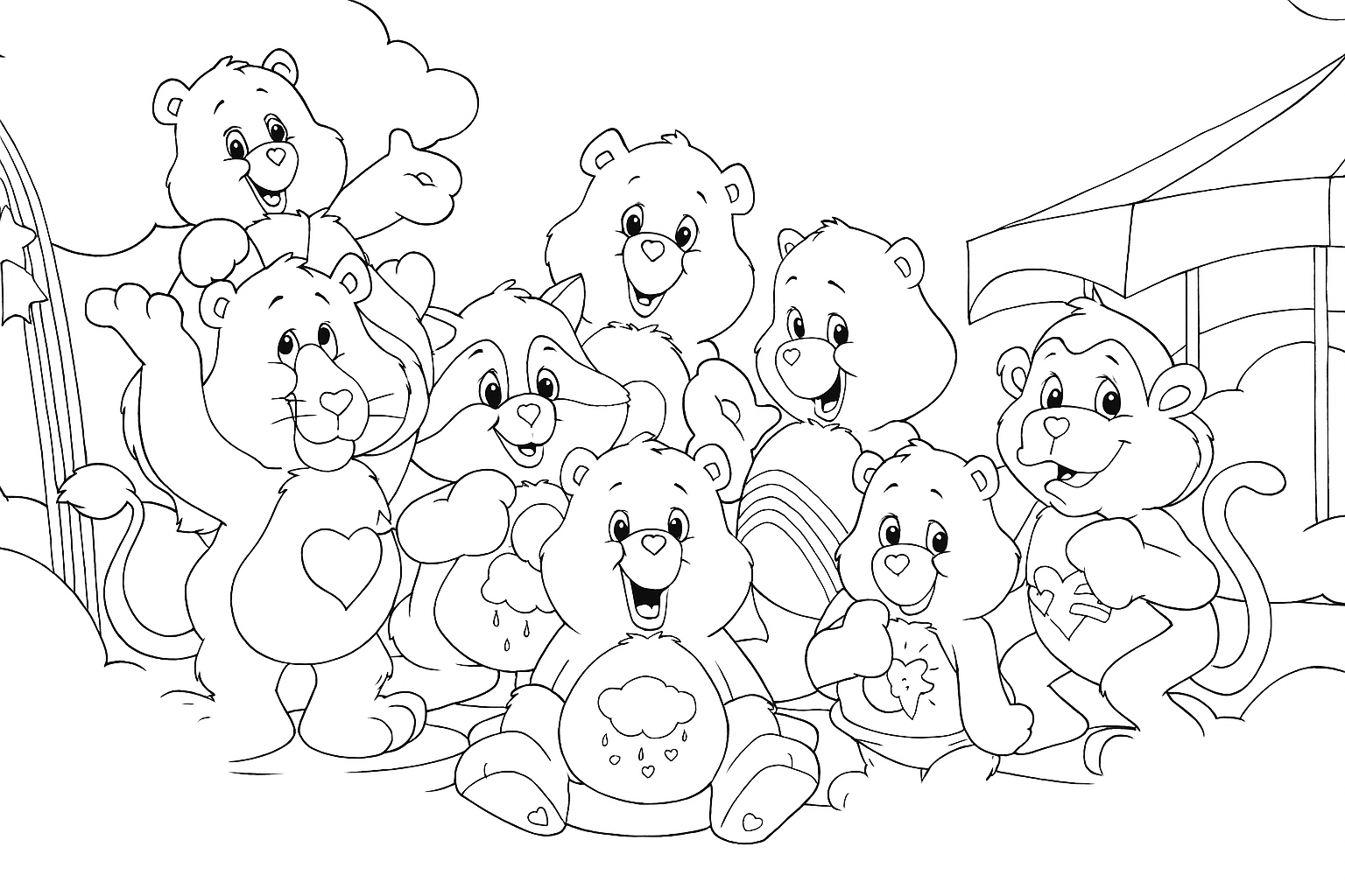 Die ganze Gruppe der Glücksbärchis zusammen in einem liebevollen Motiv zum Ausmalen.