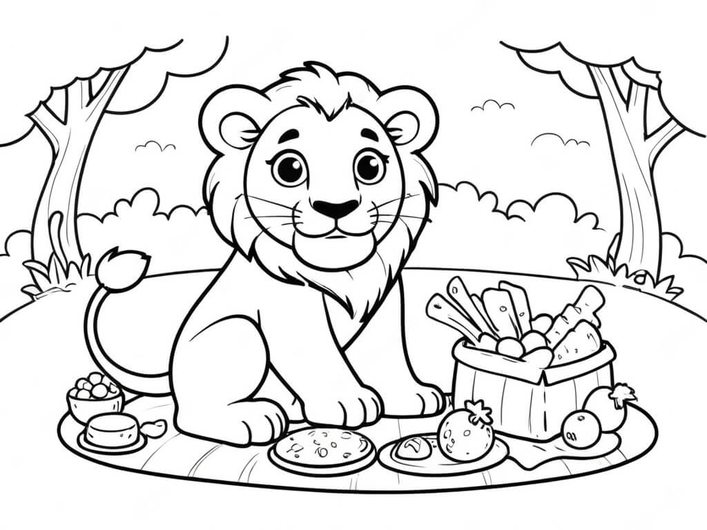 Ein lustiges Motiv – ein Löwe genießt ein Picknick! Perfekt für bunte Details.