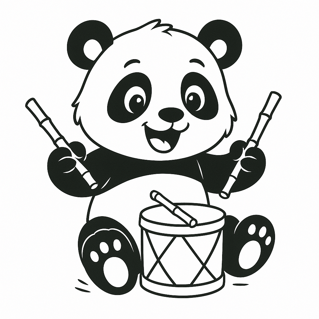 Ein musikalischer Panda, der mit Bambusstöcken Schlagzeug spielt – perfekt für kleine Musikfans.