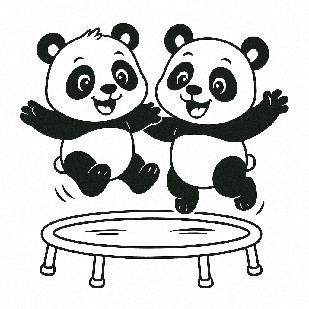 Hier toben die Pandas auf einem Trampolin – ein lustiges, bewegtes Motiv für bunte Lieblingsfarben.