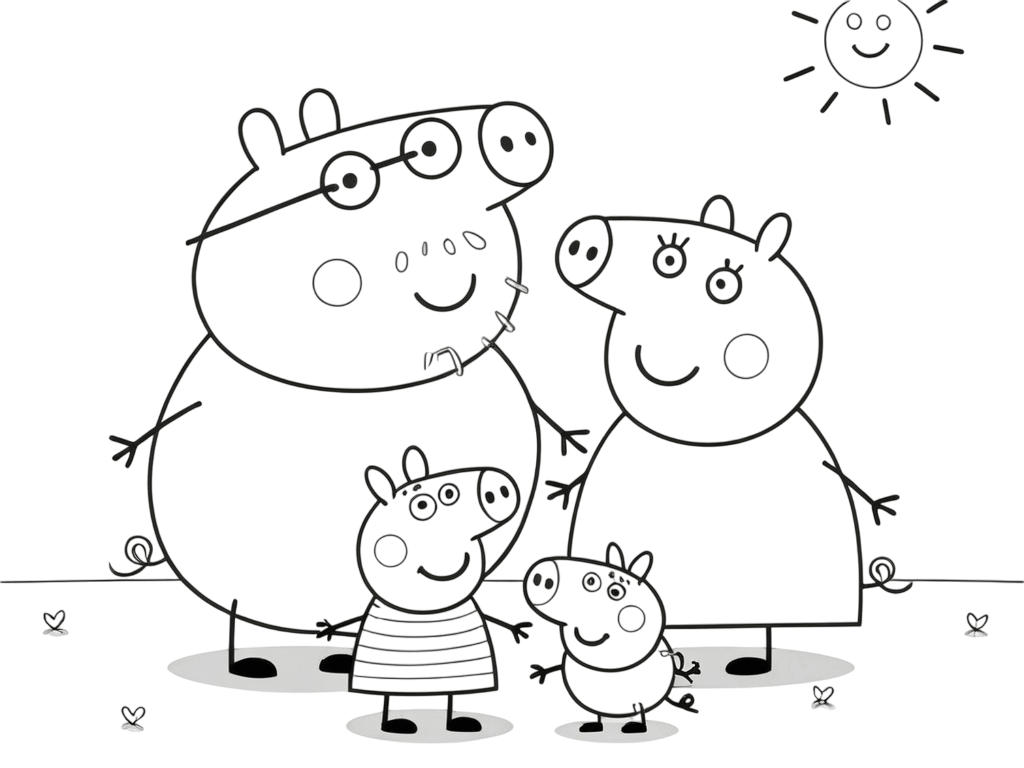 Peppa, George, Mama Wutz und Papa Wutz zusammen als fröhliche Familie – perfekt, um jeden Charakter in einer anderen Farbe auszumalen.