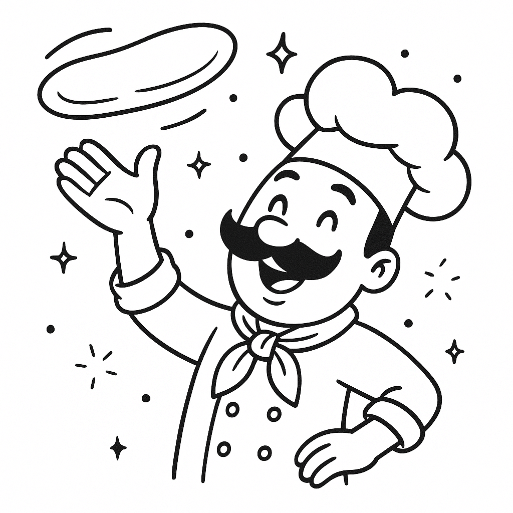 Stylische Pizza mit Schnurrbart und Kochmütze – bereit zum Ausmalen!