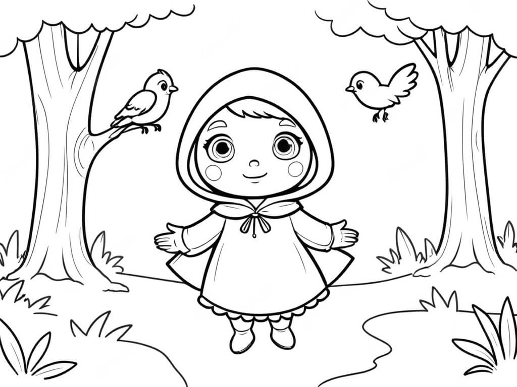 Rotkäppchen in einer harmonischen Szene mit kleinen Vögeln.