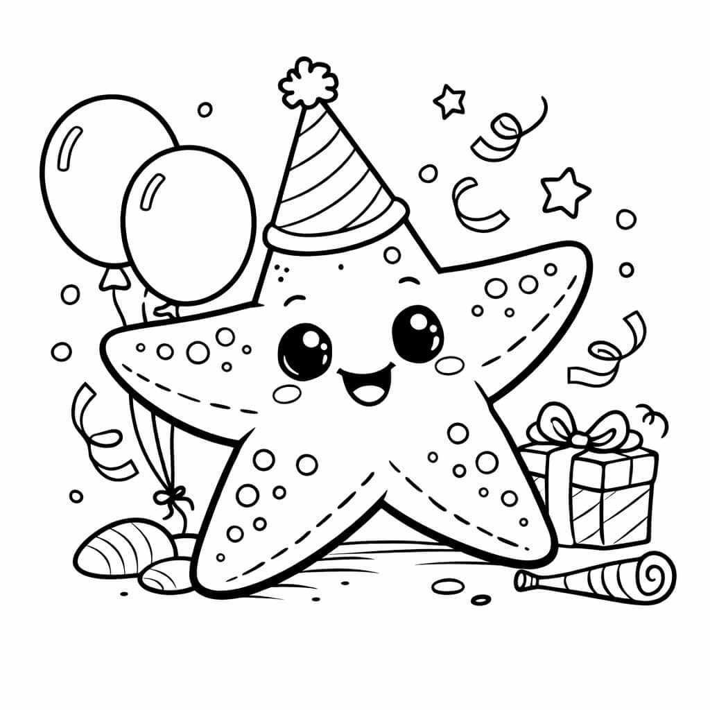 Ein fröhlicher Seestern feiert eine Party! Male ihn bunt aus und ergänze Konfetti und Luftballons.