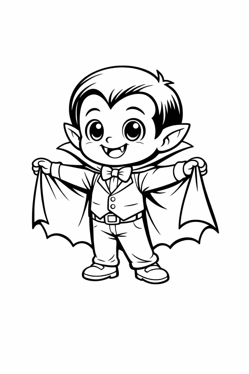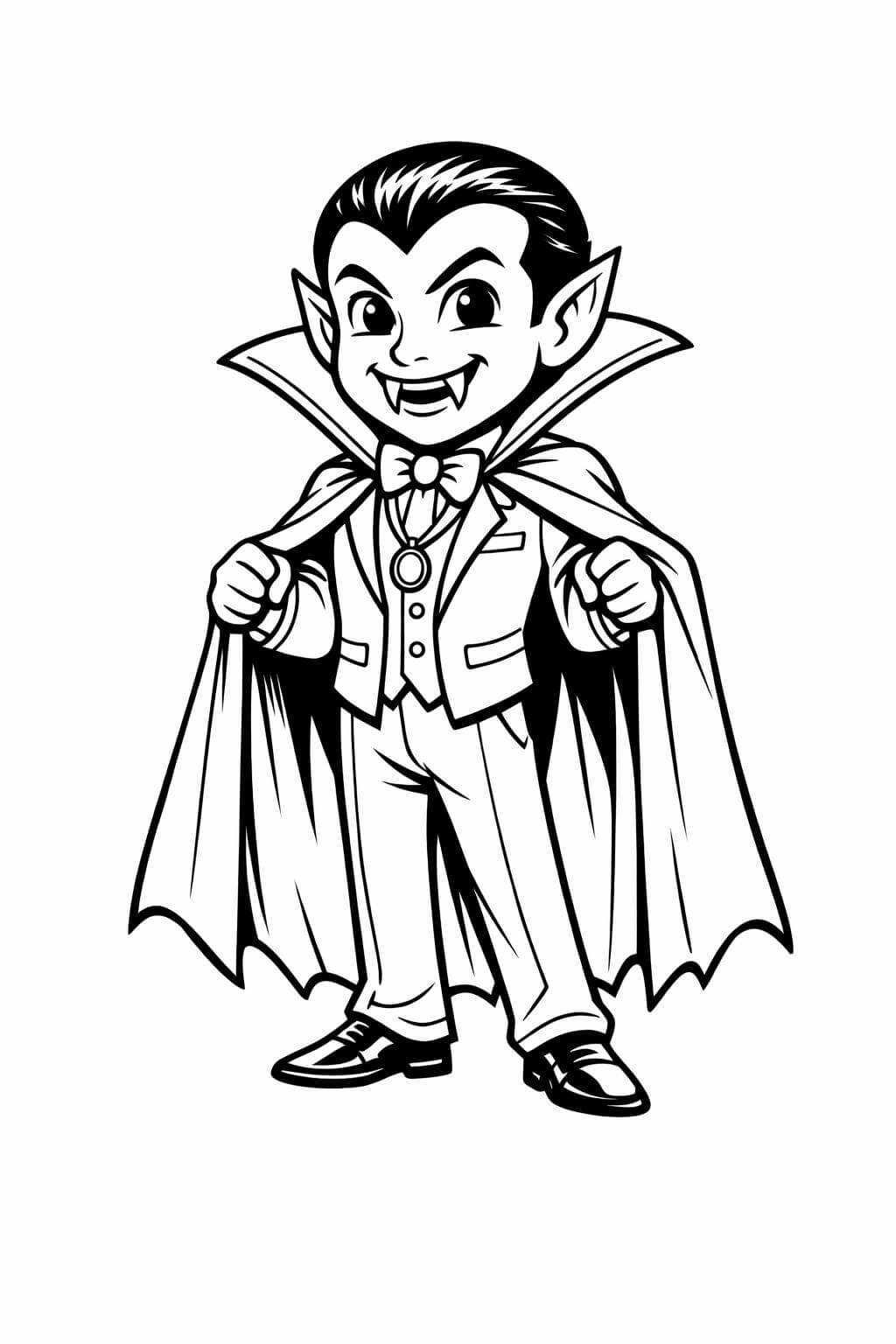 Ein Kind im Vampirkostüm – ideal für Halloween-Malvorlagen.