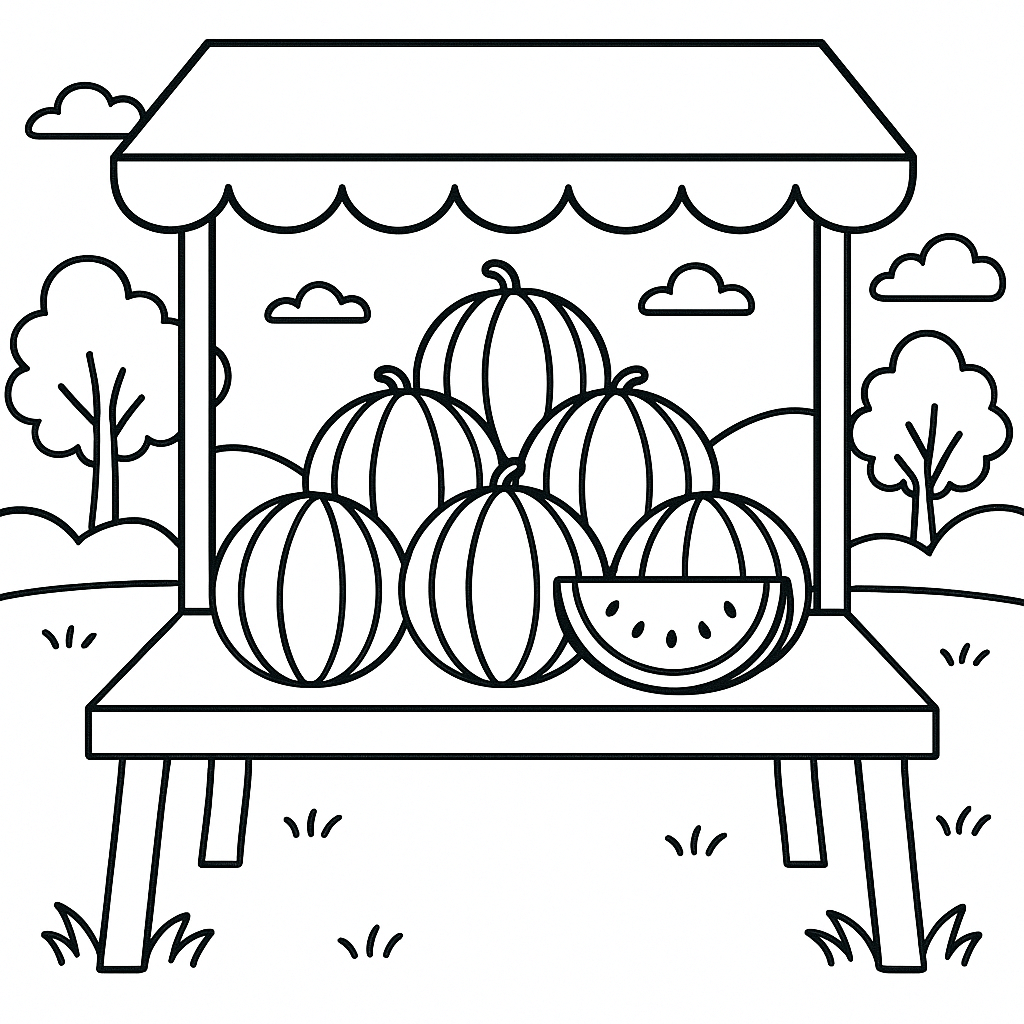Eine Marktszene mit vielen Wassermelonen zum Verkauf – fülle sie mit kräftigen Farben!