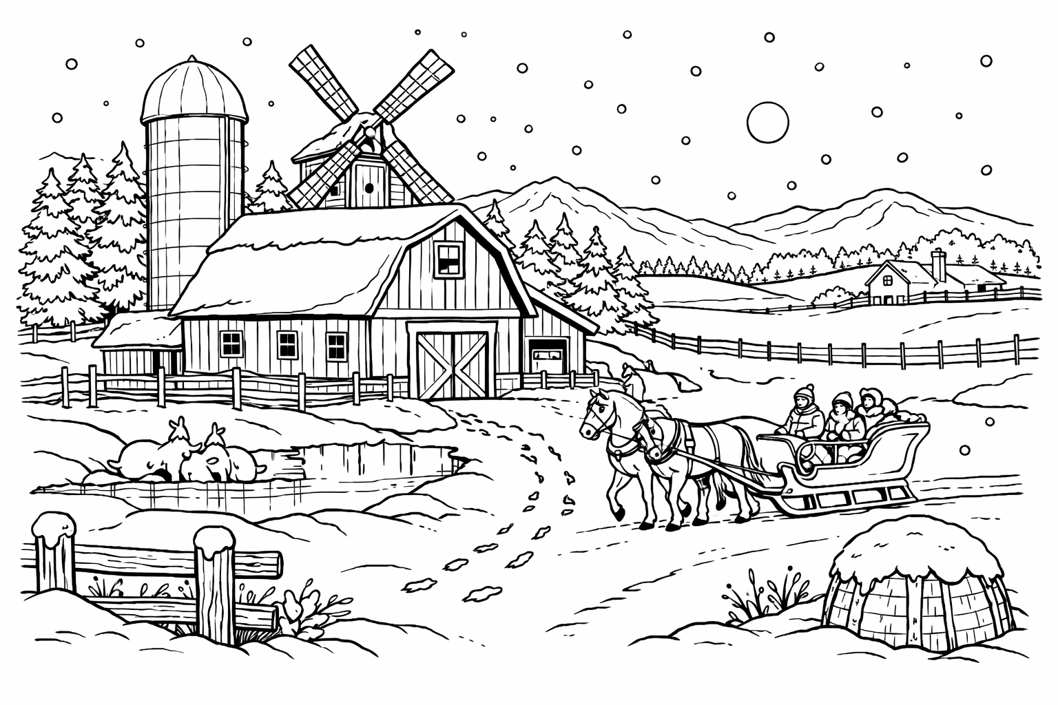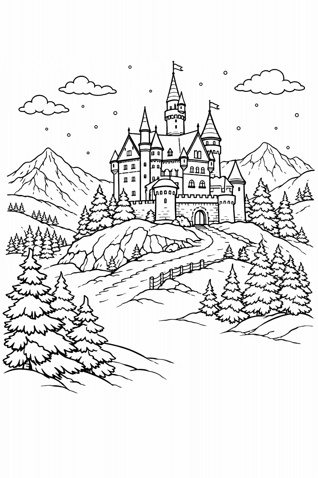 Lust auf Winterzauber auf Papier? In dieser Sammlung findest du wunderschöne Winterlandschaft Ausmalbilder: verschneite Dorfstraßen, gefrorene Seen, Winterparks und sogar ein stimmungsvolles Schloss auf dem Hügel. Ideal für Kinder und Erwachsene – einfach ausdrucken und losmalen!