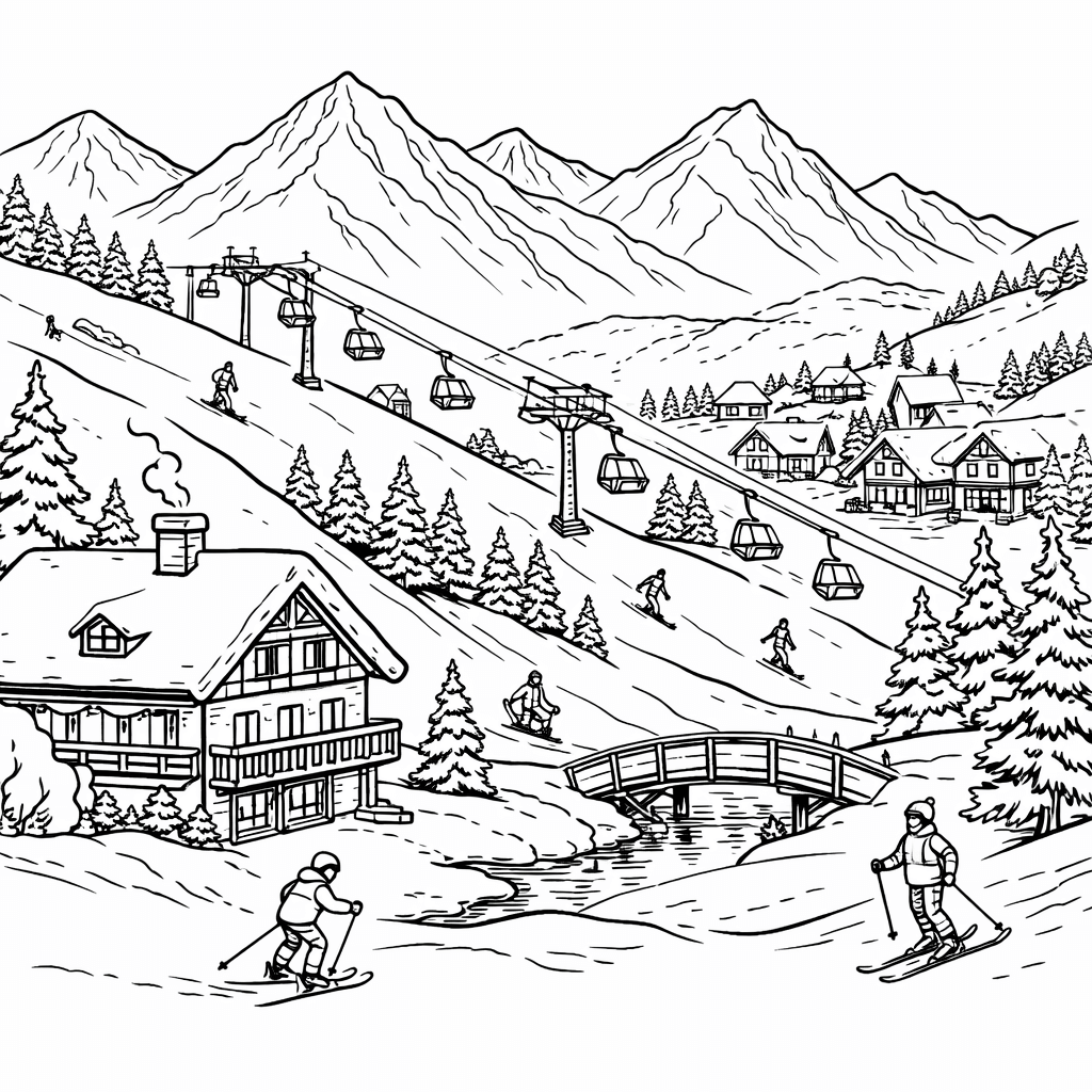 Ein lebendiger Skiort im Winter. Tipp: Nutze verschiedene Blautöne für Schatten im Schnee – so wirkt das Bild realistischer.