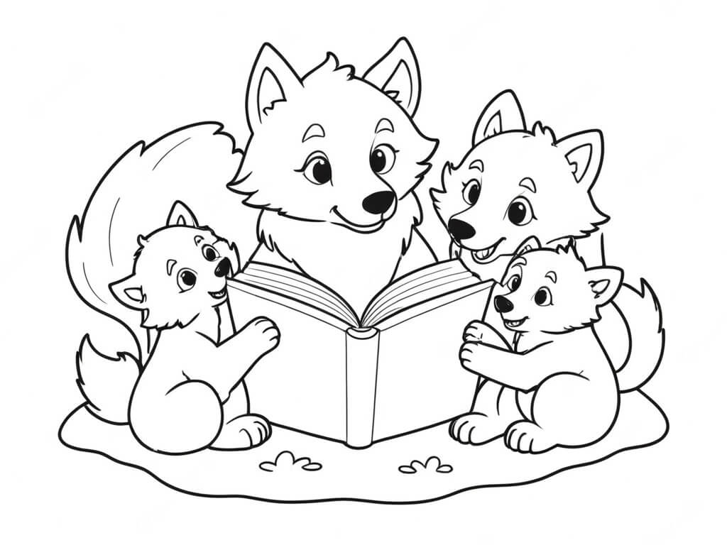 Eine liebevolle Szene einer Wolfsfamilie beim Lesen – warm und harmonisch kolorierbar.