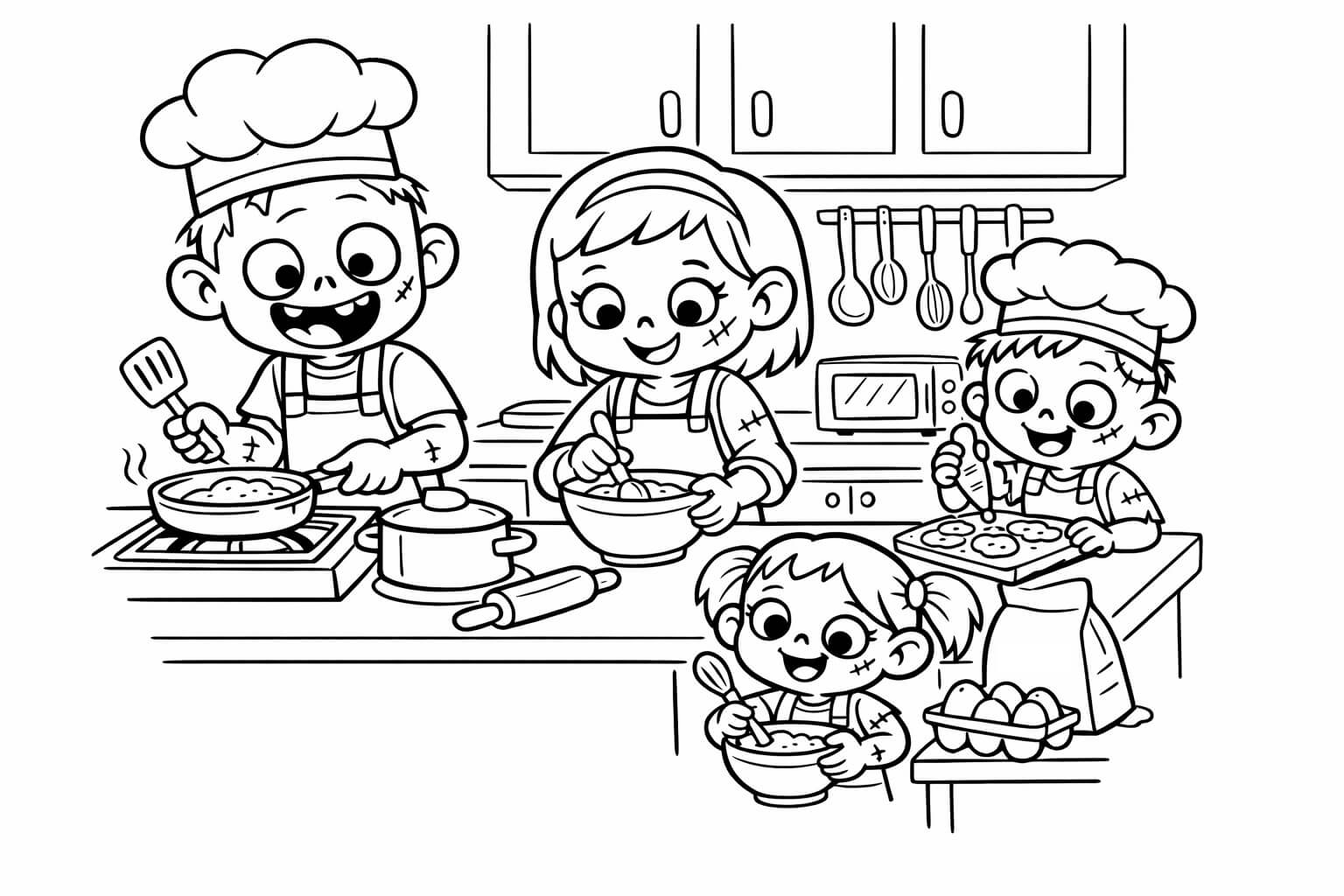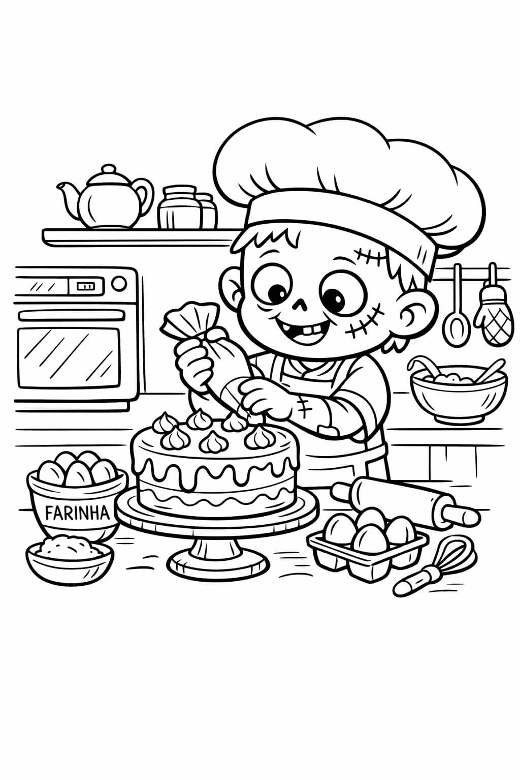 Dieser Zombie liebt Kochen! Tipp: Male die Kochmütze schön weiß und die Schürze bunt.