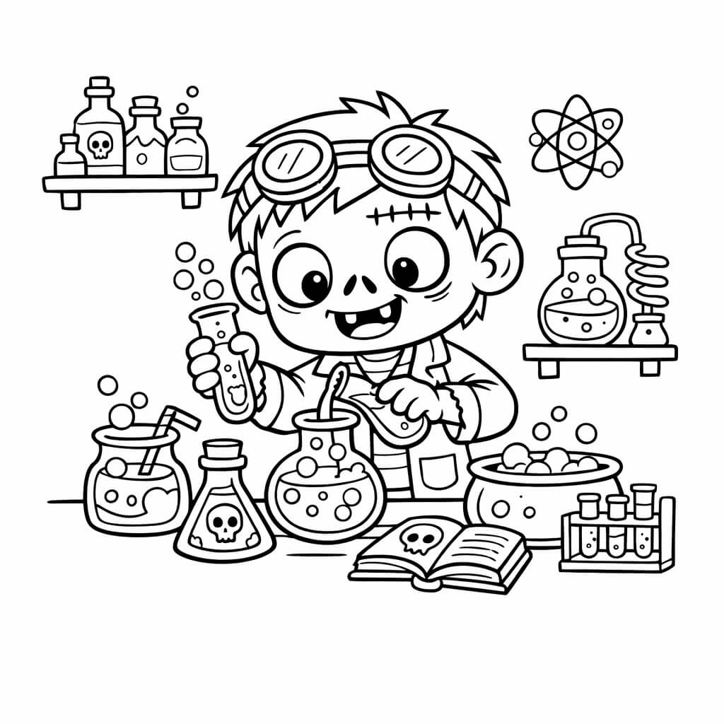 Ein Zombie im Labor beim Experimentieren. Fun Fact: Zombie-Wissenschaftler sind in Kinder-Geschichten oft besonders verrückt – aber harmlos!